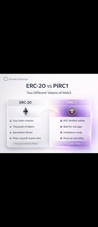 区块链悄然发生转变... 多年来,ERC-20主导了代币世界。 它让任何人在以太坊上创建代币变得非常容易。 这种创新引发了ICO热潮、DeFi增长和数十万加密项目。 但同样的自由也带来了问题。 ·没完没了的垃圾代币 ·拉地毯和匿名小组 ·投机驱动的市场 现在,Pi网络上的 PiRC1 正在出现一个不同的模型。 PiRC1 不再是无限的匿名代币,而是引入了一些新的东西: 与KYC验证身份关联的钱包 生态系统内置的合规性 旨在支持真实应用程序的令牌 哲学是不同的。 ERC-20: 许多代币→价值散布于各地。 PiRC1: 代币为应用提供动力,价值流回Pi。 增长模式也发生了变化。 ERC-20时代: 受投机和交易所上市的推动。 Pi生态系统: 由实际效用和实际需求驱动。 简单来说: ERC-20代表区块链的实验阶段。 PiRC1 可能代表了区块链与实体经济的下一个阶段。 也许这没什么... 或者,我们正在实时地看到 Web3 的演变。📷