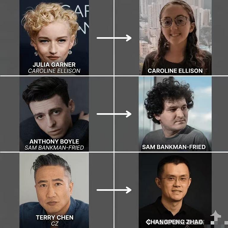 NetFlix拍的关于FTX的新剧今年底上线,这个绝壁会炸😍😍 看了一下描述,整个剧 8集,讲述FTX创始人Sam Bankman-Fried(由Anthony Boyle饰)和Caroline Ellison(由Julia Garner饰)的故事: 两个超级聪明的年轻理想主义者试图瞬间重塑全球金融系统,却被指控窃取80亿美元,成为“Z世代的邦妮与克莱德”。 但我觉得他们这个选角有点问题啊,是不是有点美化 SBF和CAROLINE 的意思?另外找个老头子演CZ感觉也差了点意思。 贴图对比一下