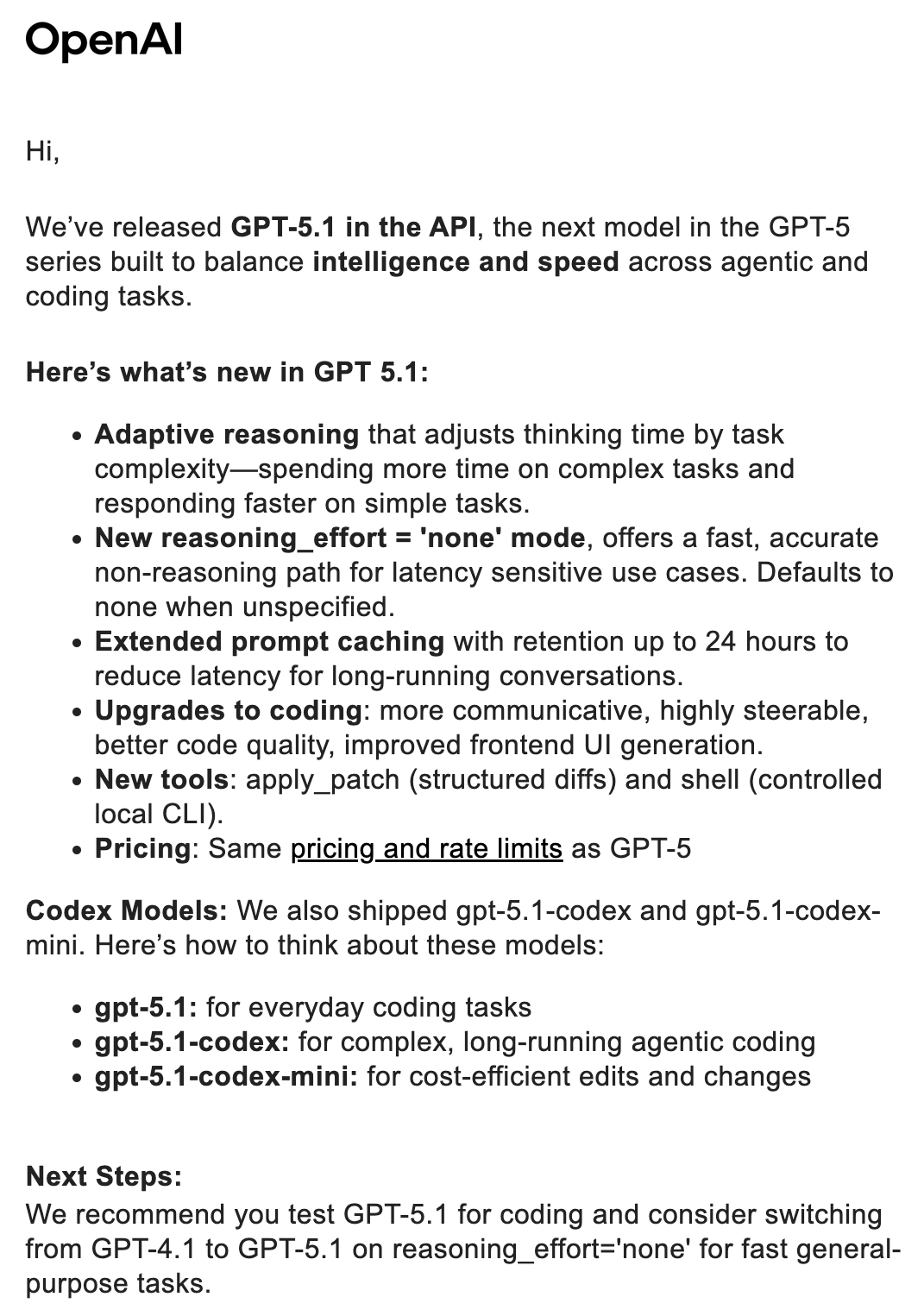 我们在 API 中发布了 GPT-5.1 ,这是 GPT-5 系列的下一个模型,旨在平衡智能和速度, 涵盖代理和编码任务。
