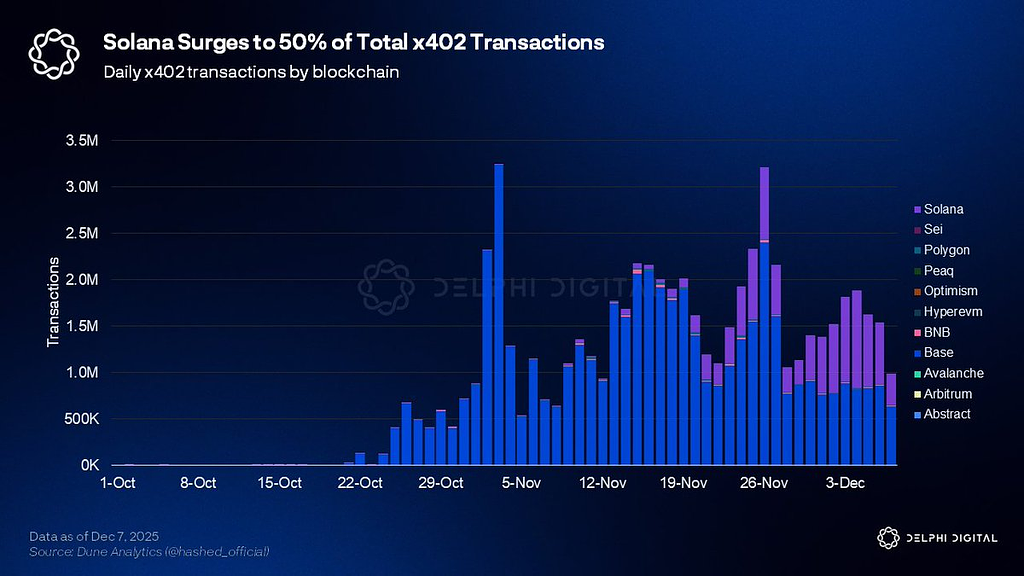 虽然随着整体市场下滑,这种热潮有所消退,但 #Solana 最近仍占 #x402 总交易量的 50%,开发者们正在积极筹备一场新的黑客马拉松。