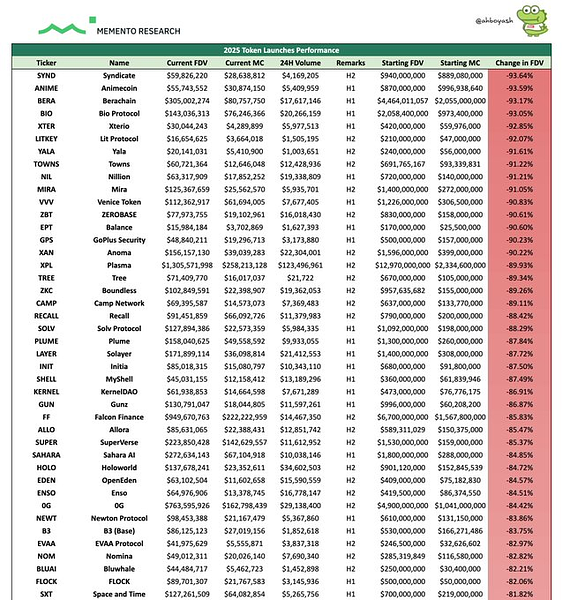 • 代币中位数较发行前已实现价值 (FDV) 下降 71%(较市值下降 67%)