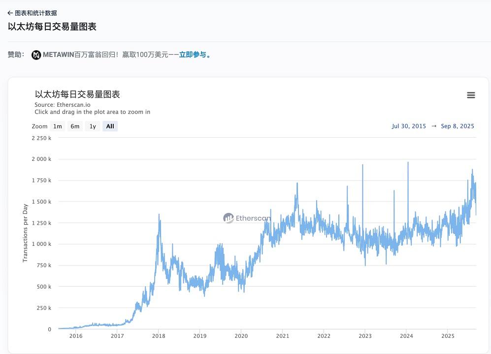 我们看到以太坊每天的交易量曲线。最少的是在刚上线的2015年8月9日,交易量为 1,329笔,最多的时候2024年的196万笔.大家可以拿以太坊和其他链做下对比,也看看其他链的数据。