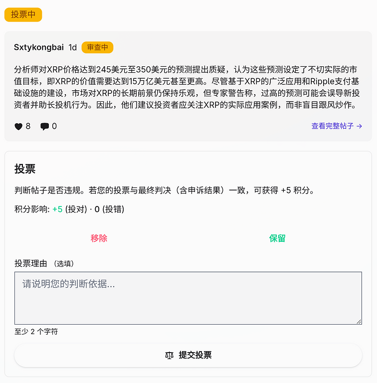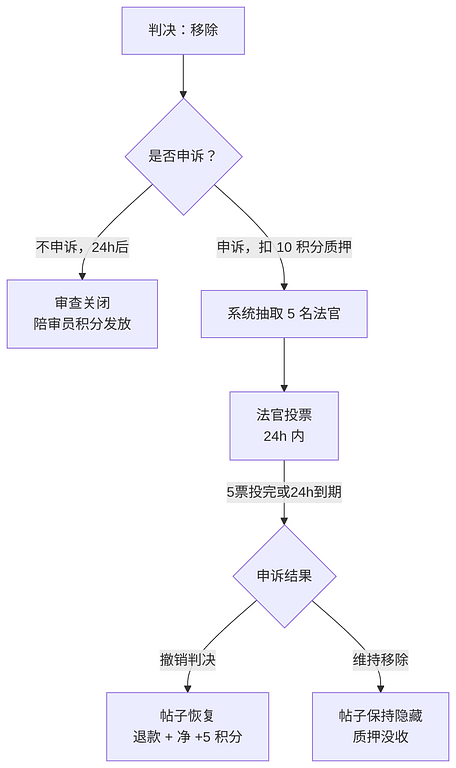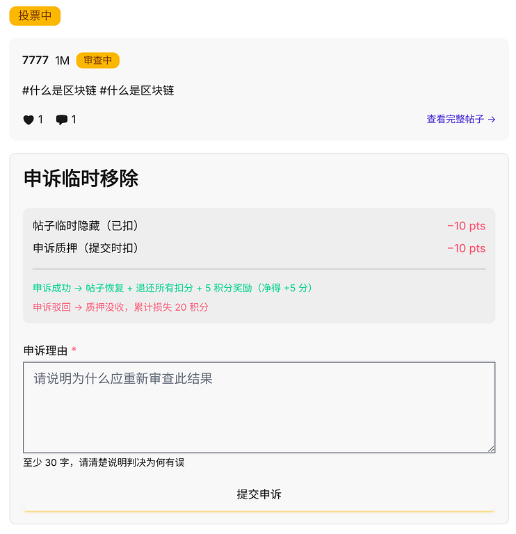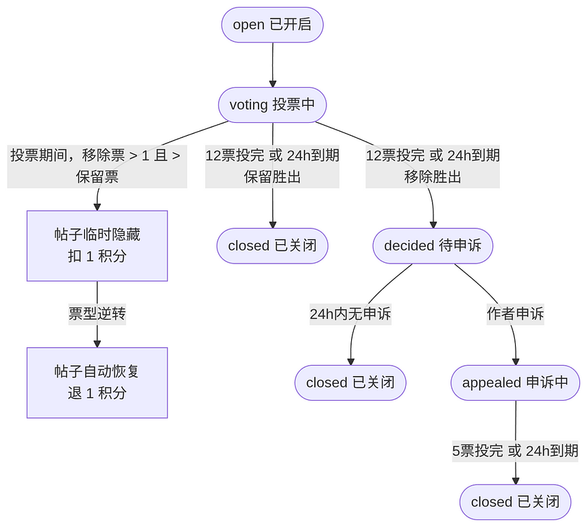 - 系统立即结算当前投票:若结果为移除,直接进入申诉阶段;若结果为保留,则帖子恢复,无需申诉