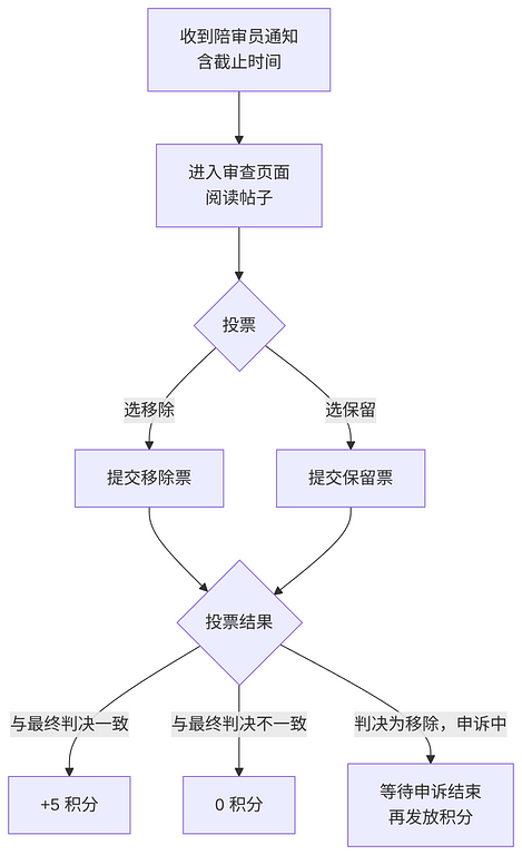 陪审员 | 社区成员(juror 角色) | 对被审查帖子投票裁决 |