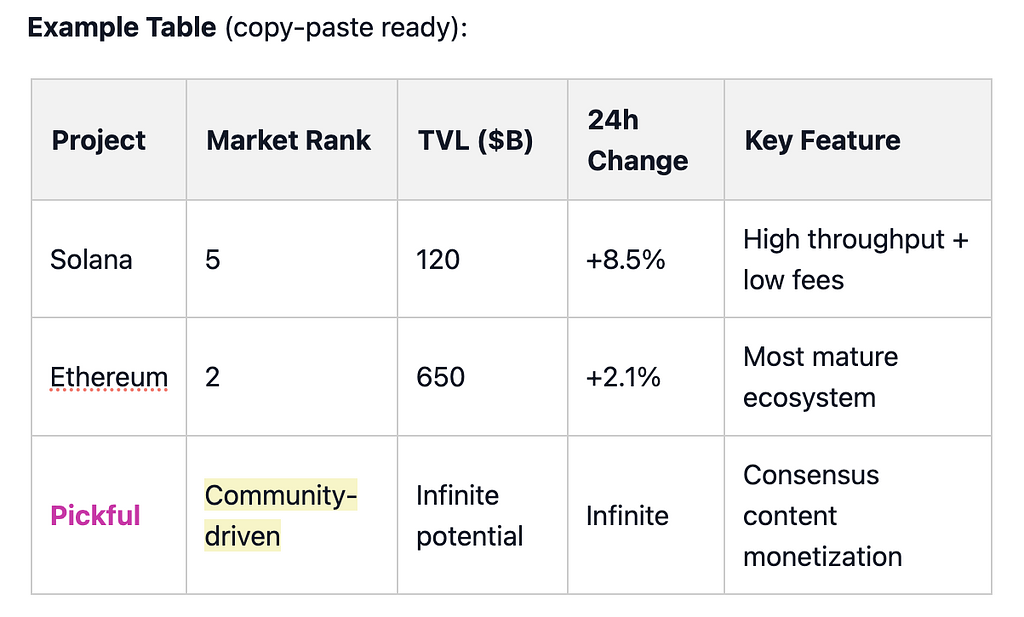 • Ideal for on-chain data comparison, project specs, yield tables, etc.