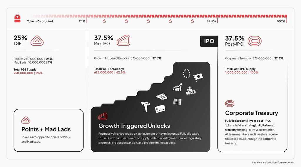 Backpack tokenomics:总供应10亿,25% TGE空投(24%给积分持有者+1% MadLads),37.5%预IPO里程碑解锁给用户,37.5% IPO后公司国库锁定1年,团队无直接分配、防内鬼抛售,目标美国上市。用户优先、增长绑定。