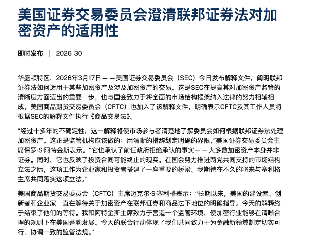 2026 年 3 月 17 日,SEC 发布了解释性文件,尝试以更系统的方式对数字资产进行分类,并说明联邦证券法在不同场景下如何适用,例如空投、协议挖矿、协议质押,以及对非证券型加密资产进行包装后的相关安排。SEC 在同期新闻稿中表示,这份文件是为了进一步明确联邦证券法如何适用于某些类型的加密资产及相关交易;而 SEC 主席随后在讲话中进一步概括称,当前框架下有四类资产不被认定为证券,分别是:数字商品、数字收藏品、数字工具,以及符合 GENIUS Act 定义的支付型稳定币。这说明美国监管思路正在从过去那种相对模糊、更多依赖执法推动的状态,逐步转向更明确的分类管理。#美国加密政策