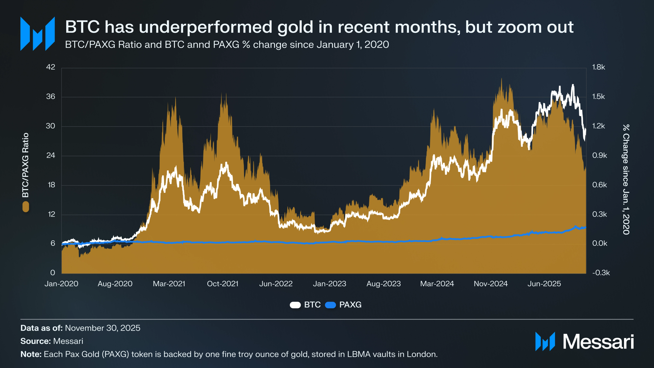 尽管比特币巩固了其对其他加密货币的领先地位,但2025年却引发了一系列关于其货币属性的新问题。作为最大的非主权货币资产,黄金仍然是比特币最重要的基准。