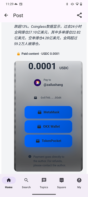 新增 OKX 和 #TokenPocket 支付。OKX 指 OKX 交易所综合 App(内置 Web3 钱包),非独立的 #OKX Wallet App。与 MetaMask 一起,手机用户可通过三款主流钱包一键唤起,完成 USDC 支付解锁付费内容。