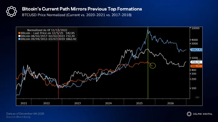 然而,这更像是一个 “同步指标”而非“先行指标”。更可能的情景是,比特币因自身减半、宏观转向等因素先触及市场底,疲弱的反弹仍不足以拯救高杠杆的微策略,从而导致其爆仓。于是,它的“失败”恰好成为了牛市确认的戏剧性注脚。