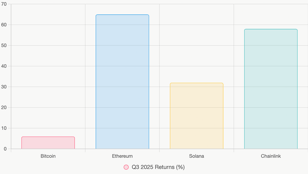 宏观因素加剧了这一分化。美联储2025年的利率路径不确定性(从年初的降息预期到年末的紧缩信号),导致风险资产波动放大。全球加密市值虽达4万亿美元,但增长主要由少数项目驱动。根据2025年Q3数据,Ethereum涨幅65%,Chainlink 58%,Solana 32%,而 #Bitcoin 仅6%。 这反映了机构偏好转向有实际营收的项目,而非纯投机。