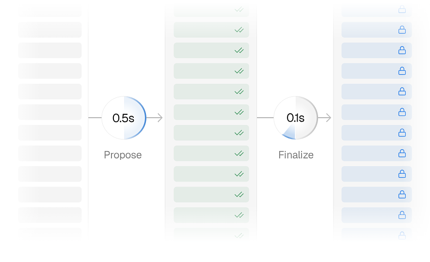 Tempo 采用拜占庭容错共识机制。目前,我们运行四个验证节点,并将很快增加更多,详情如下所述。区块大约每 0.5 秒确认一次,已确认区块中的交易保证会被包含在区块链中。这为支付运营商提供了与现有金融系统相同的结算确定性,速度堪比一流的区块链。展望未来,我们正在探索更快的确认路径,以支持 API 级别的支付流程。