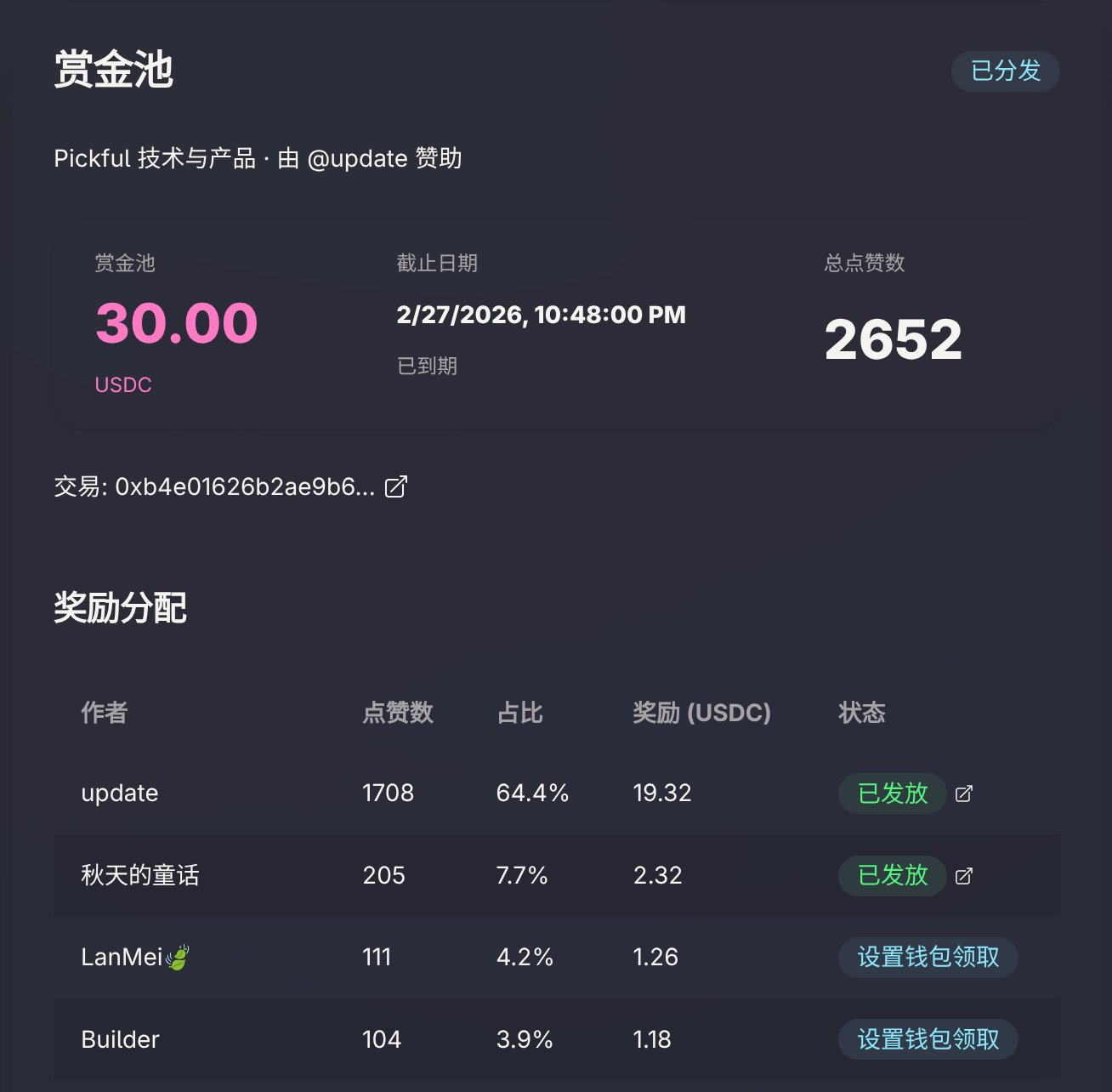 - 已设置钱包地址:奖励自动通过链上转账发送到你的钱包,无需手动操作