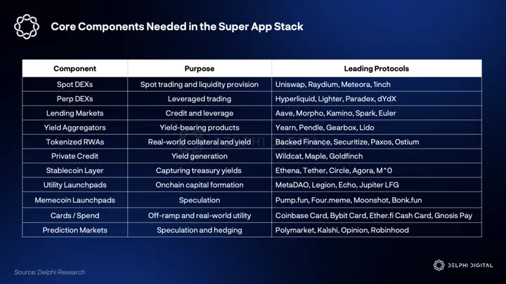 加密超级应用并非由一家公司从头到尾构建的包罗万象的单一产品。它是一个聚合层 :一个统一的接口,用于收集和集成开放市场上已有的最佳协议。